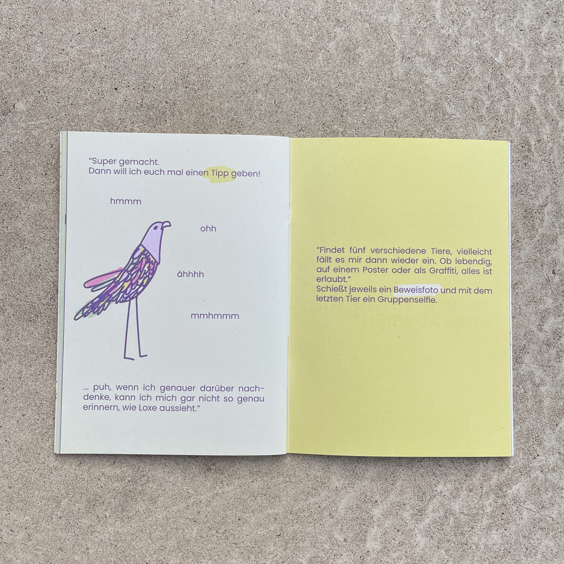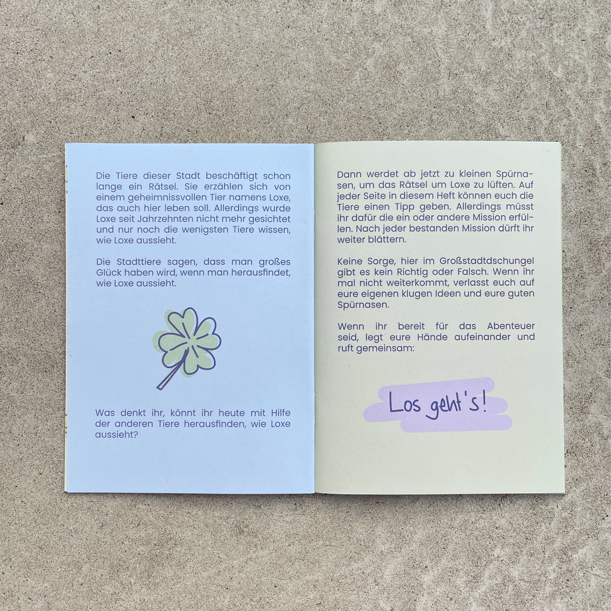 Dieses Heft ist der Anfang einer Reise durch den Großstadtdschungel. Schnappt Euch Eure Eltern, Geschwister oder Freunde und macht Euch auf die Suche nach dem geheimnisvollen Tier Loxe - und nichts weniger als dem Glück. Keine Sorge, ihr seid dabei nicht alleine, die tierischen Stadtbewohner*innen Affe Dari, Mader Mecki, Schlange Boba und die alte Elster Tara werden Euch dabei helfen.